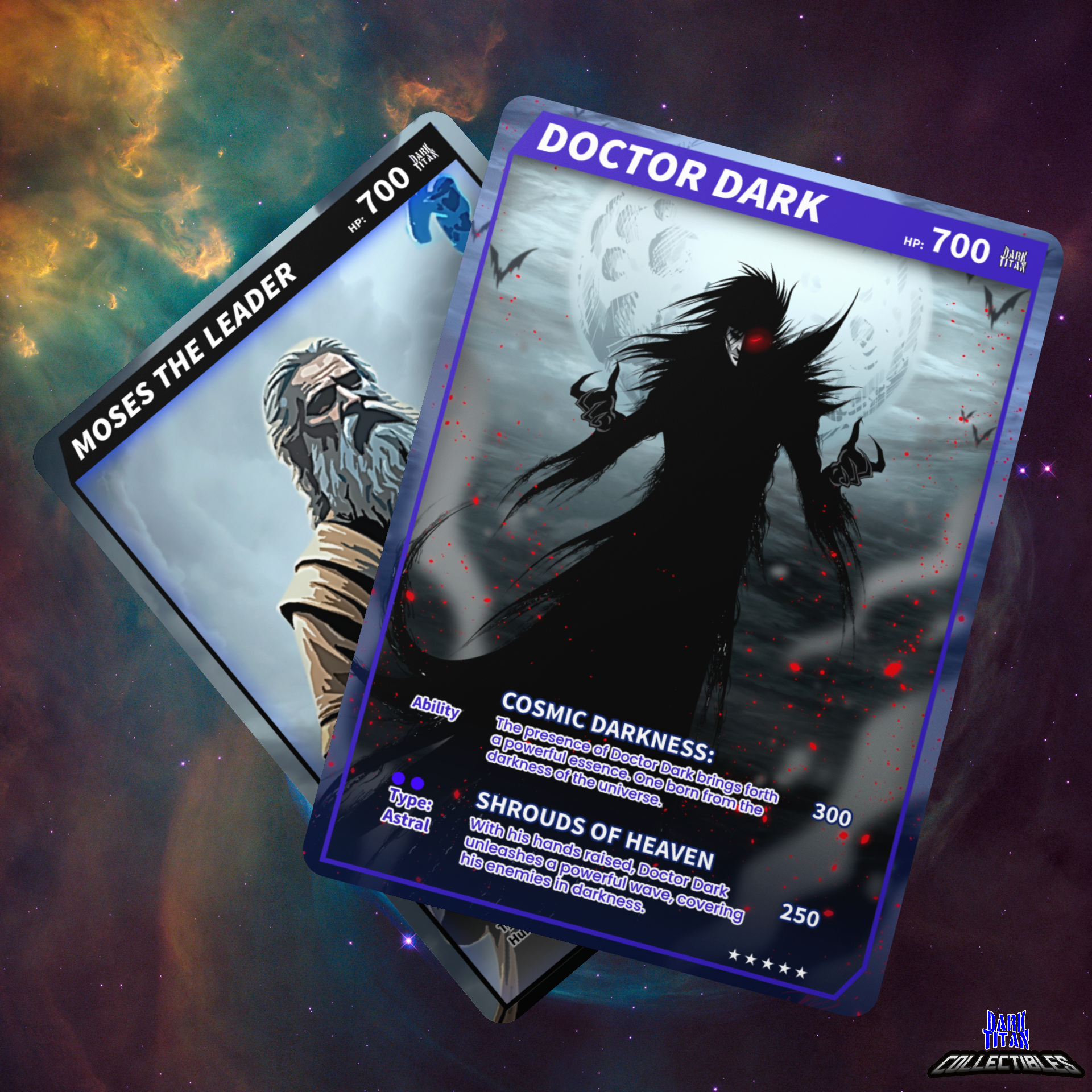 PREVIEW: Trading Cards of Moses The Leader (Dark Titan’s The Haunted City) and Doctor Dark (Dark Titan Universe)